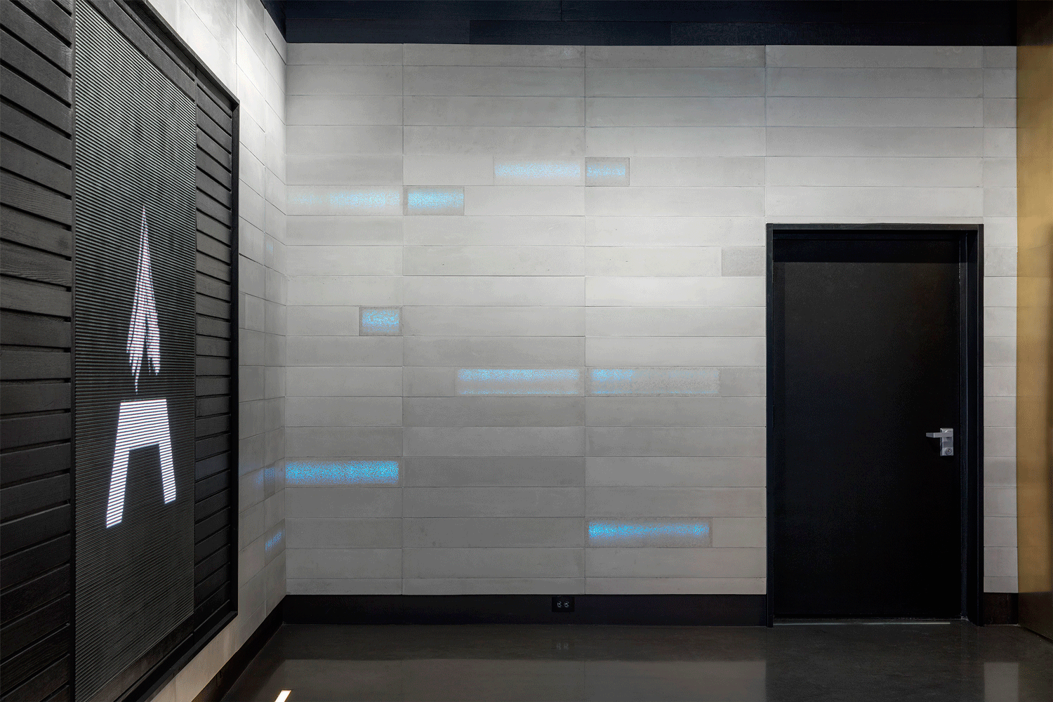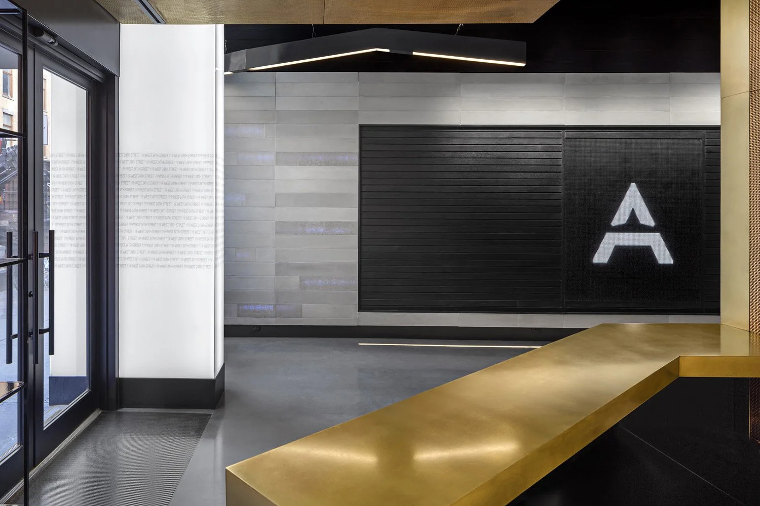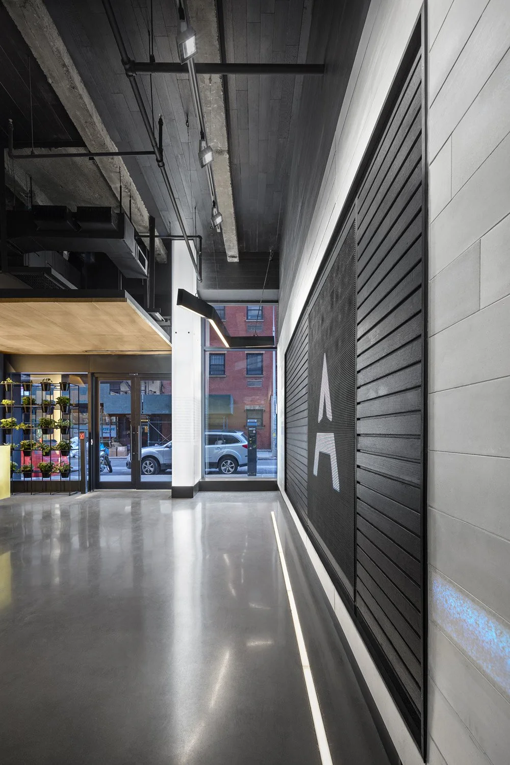 This commercial building had been largely vacant for over 25 years and required entirely new building services, extensive exterior maintenance, new lobbies and storefront, fire safety systems, and new elevators. The lobby interior materials are a combination of brass, charred wood and perforated concrete with LED panels behind.